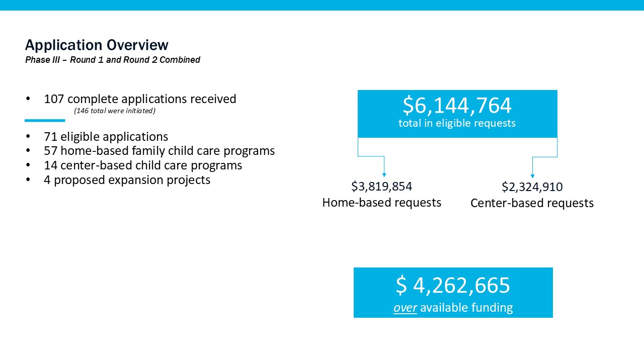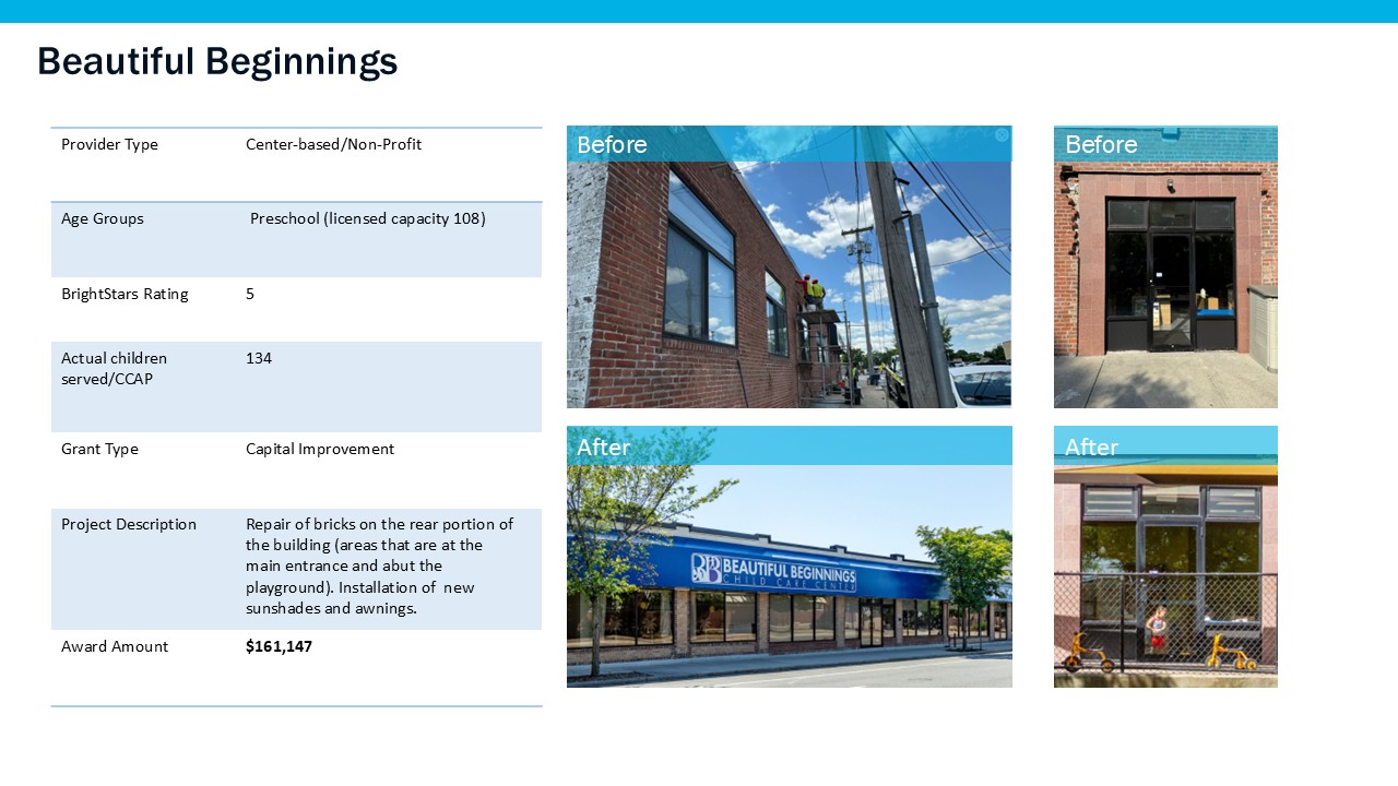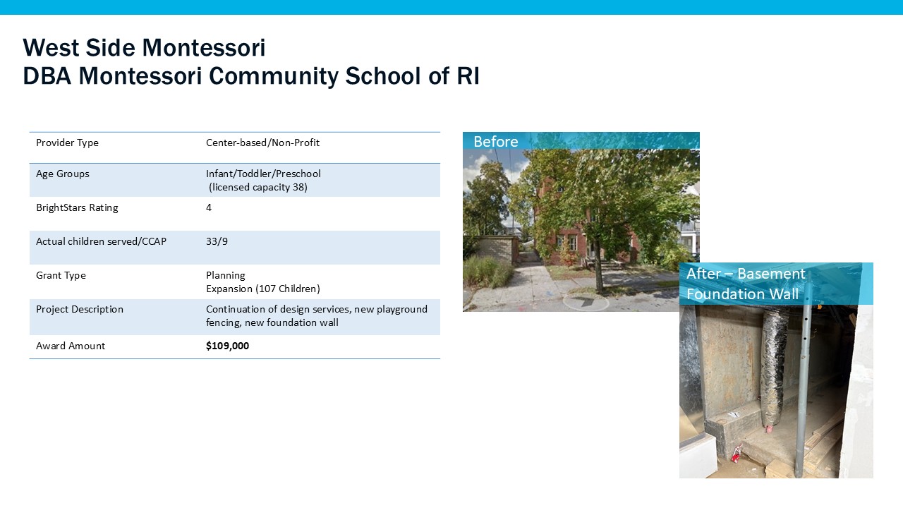 Building upon the success of the first and second phase of the City of Providence Early Learning Facilities Improvement Grants program, City of Providence Mayor Brett Smiley partnered with LISC’s RI Child Care and Early Learning Facilities Fund for a third phase to administer $1,975,000 for continued child care facility improvements. A total of $1,570,350 was allotted specifically for facility pass-through grants. The City has continued to invest in this program in recognition of the ongoing need for increased access to high-quality early learning programming.
