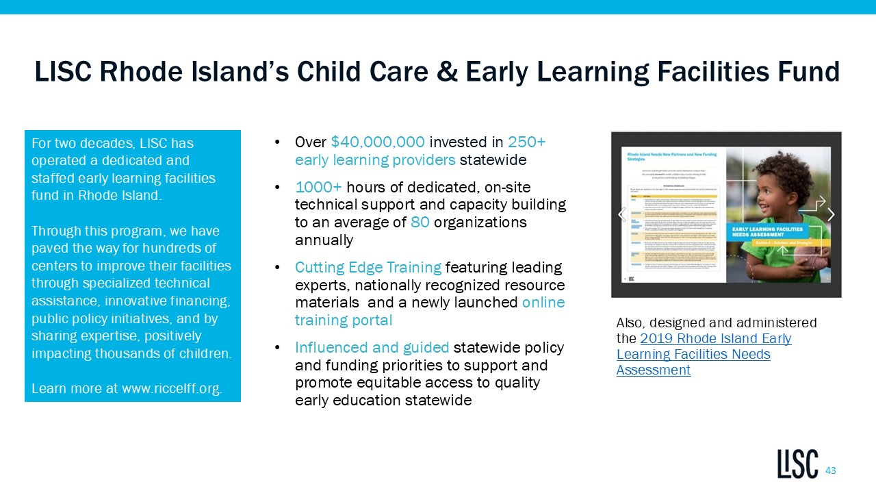 For questions, please contact the LISC Rhode Island Child Care Facilities Fund team at riccelff@lisc.org.